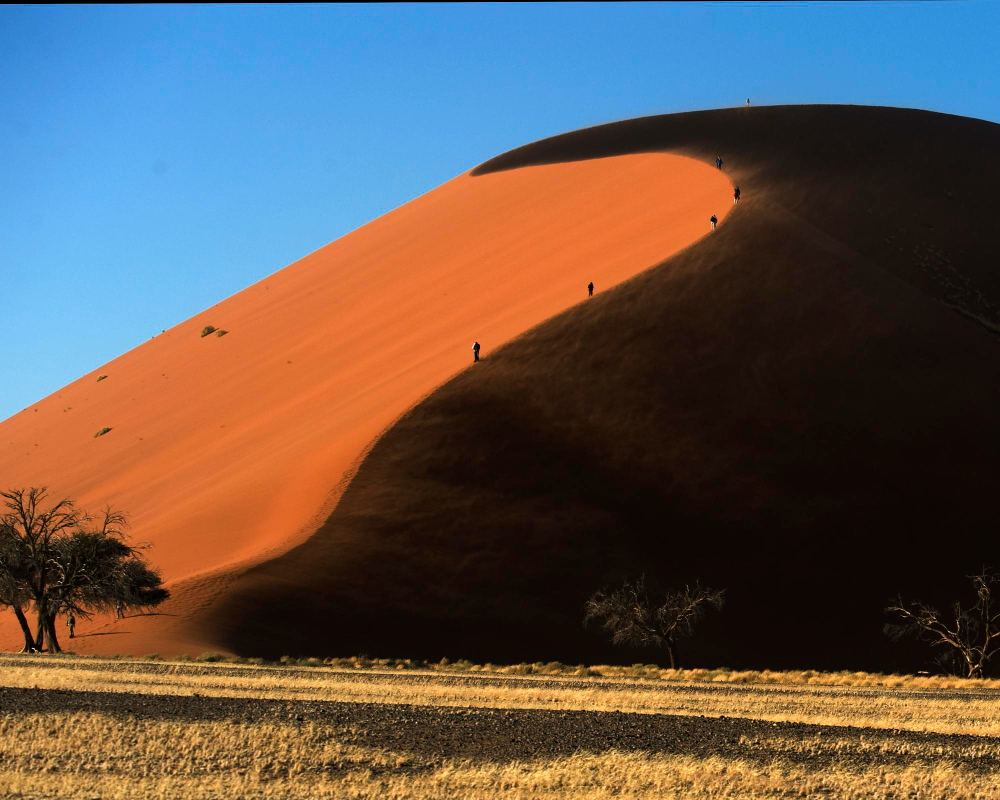 Na zahodni obali Namibije leži Namib, ena najstarejših puščav na svetu. Njene rdeče sipine, med katerimi izstopa legendarna Duna 45, so med najbolj fotografiranimi motivi Afrike. V središču puščave leži Deadvlei, suha dolina s posušenimi akacijami, ki ustvarjajo nadrealistično pokrajino. Kljub surovi naravi v Namibu uspevajo številne živali, kot so oriksi, puščavski sloni in hijene, ki so se popolnoma prilagodile ekstremnim razmeram.