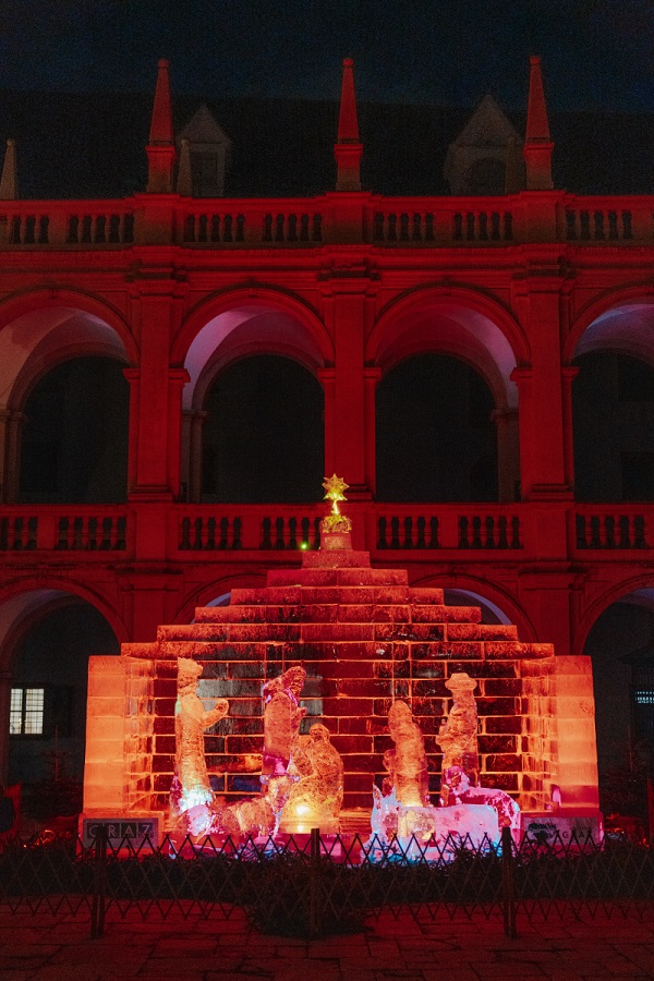 Prava svetovna posebnost so znamenite ledene jaslice na dvorišču deželne hiše: iz približno 40 ton ledu mednarodni umetniki oblikujejo božično zgodbo v ledeno umetnino – minljivo, poetično in čarobno osvetljeno. Obdana z renesančnimi fasadami je simbol bežeče lepote trenutka.