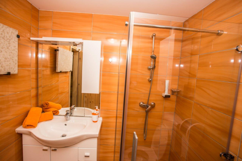 V kopalnici so na razpolago brisače, kopalni plašč, copati, wc papir ter pribor za osebno higieno (tuš gel, šampon, zobna krtačka z zobno pasto, britvice, brivska pena…)