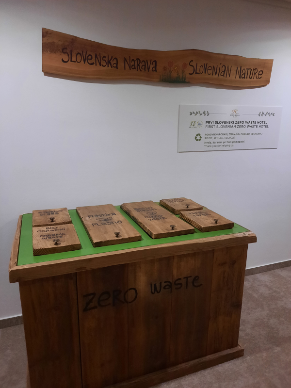Celotna zgodba resorta je napletena okoli skrbi za okolje. Ribno Alpine Resort je prvi in zaenkrat tudi še edini hotel oz. resort v Sloveniji, ki je prejel certifikat Zero Waste Hotel. Zares sva na vsakem koraku opazila, da ne gre le za nek ”marketinški” trik, pač pa hotel dejansko stremi k trajnostnemu razvoju. Prva zanimivost je, da v sobah ni košev za smeti, so pa v vsakem nadstropju postavljeni leseni zabojniki za ločevanje odpadkov. Na splošno celoten hotel zaznamuje les in marsikateri kos pohištva je narejen iz starega slovenskega lesa. Plastike v hotelu praktično ni.