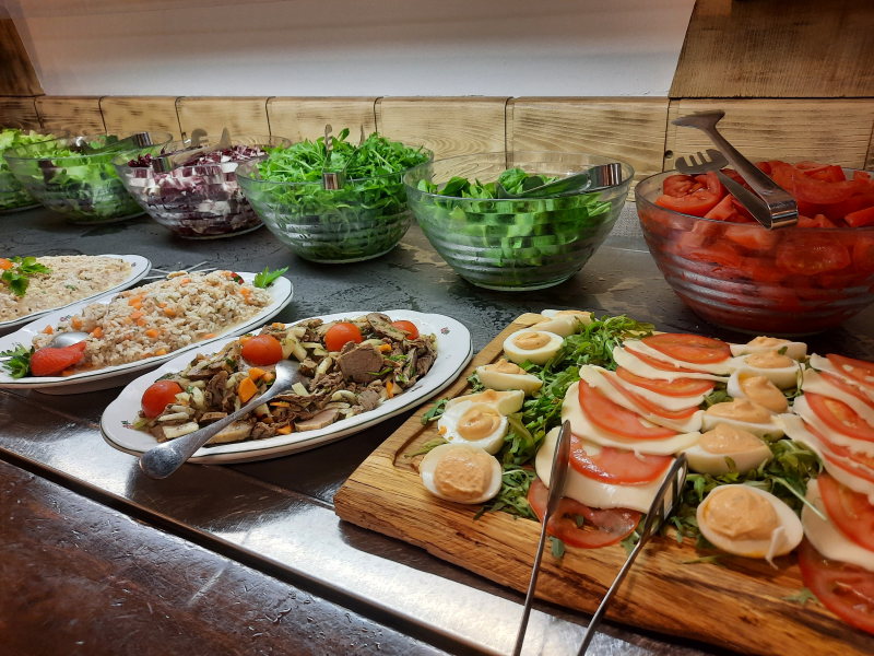 Med bivanjem pa so seveda dobro poskrbeli tudi za najine želodčke. V hotelski restavraciji sta na voljo samopostrežni zajtrk in večerja. Izbira je pestra, tako da bo zagotovo vsak našel kaj po svojem okusu. Za večerjo smo lahko izbirali med mesnimi in ribjimi jedmi, različnimi prilogami in dvema vrstama juh. Seveda je na voljo solatni bar, za konec pa še sveže sadje in pestra izbira sladic.