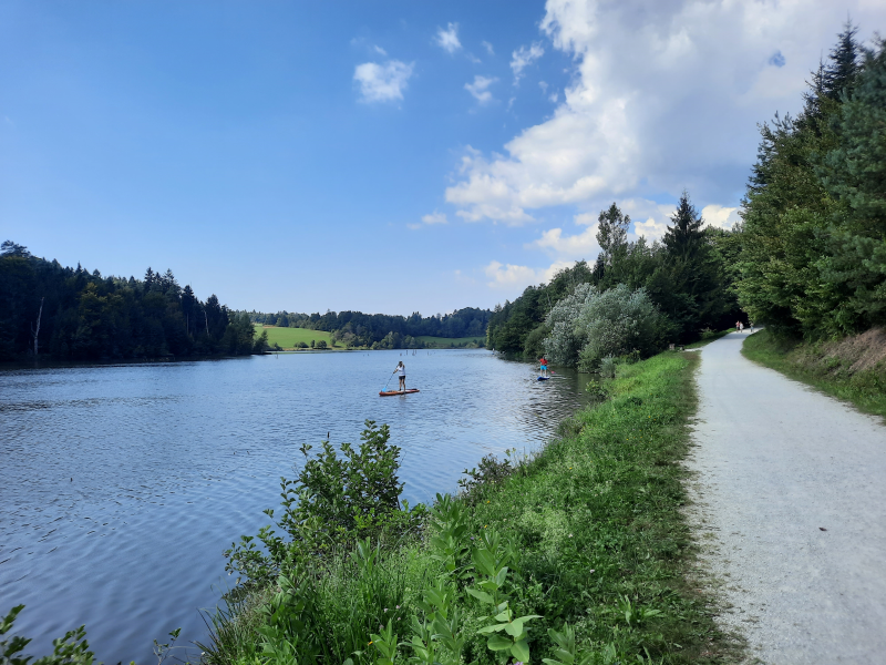 Krožna pot okoli jezera meri 4,2 km in jo lahko prehodimo ali prekolesarimo. Midva sva se odločila za prijeten sprehod okoli jezera, za kar sva potrebovala približno 1 uro. Pot je lepo urejena in zaprta za ves promet.