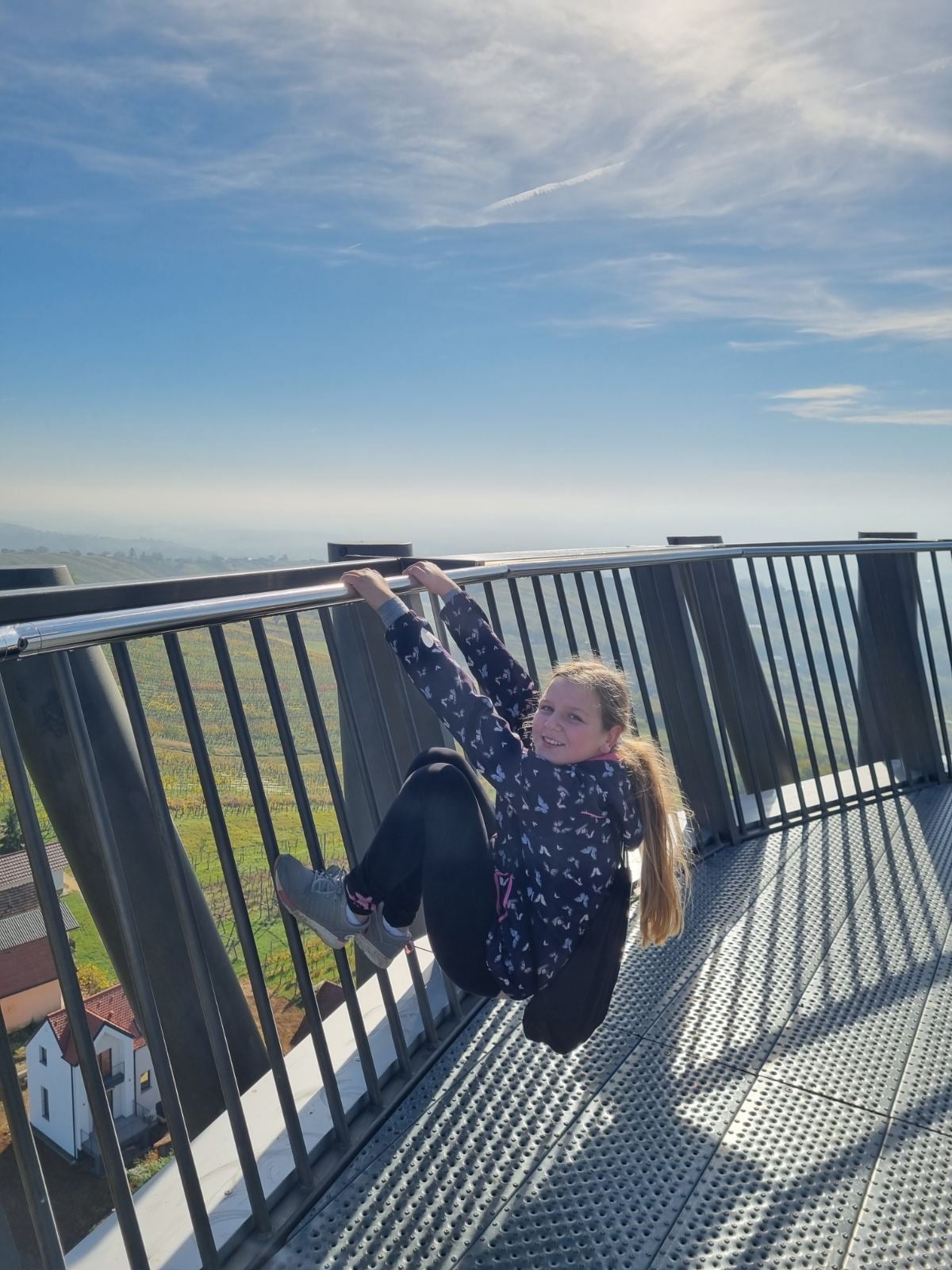 Zadnji dan sva se odpravili na stolp Vinarium; do njegovega vrha oziroma razgledne terase je potrebno prehoditi 240 stopnic. Če imaš srečo, lahko ob lepem vremenu z vrha vidiš vse do Dunaja, Budimpešte in seveda do nekaterih drugih prelepih slovenskih območij. S pogledom zaobjameš štiri države; orientacijo nudijo tudi table z oznakami mest.