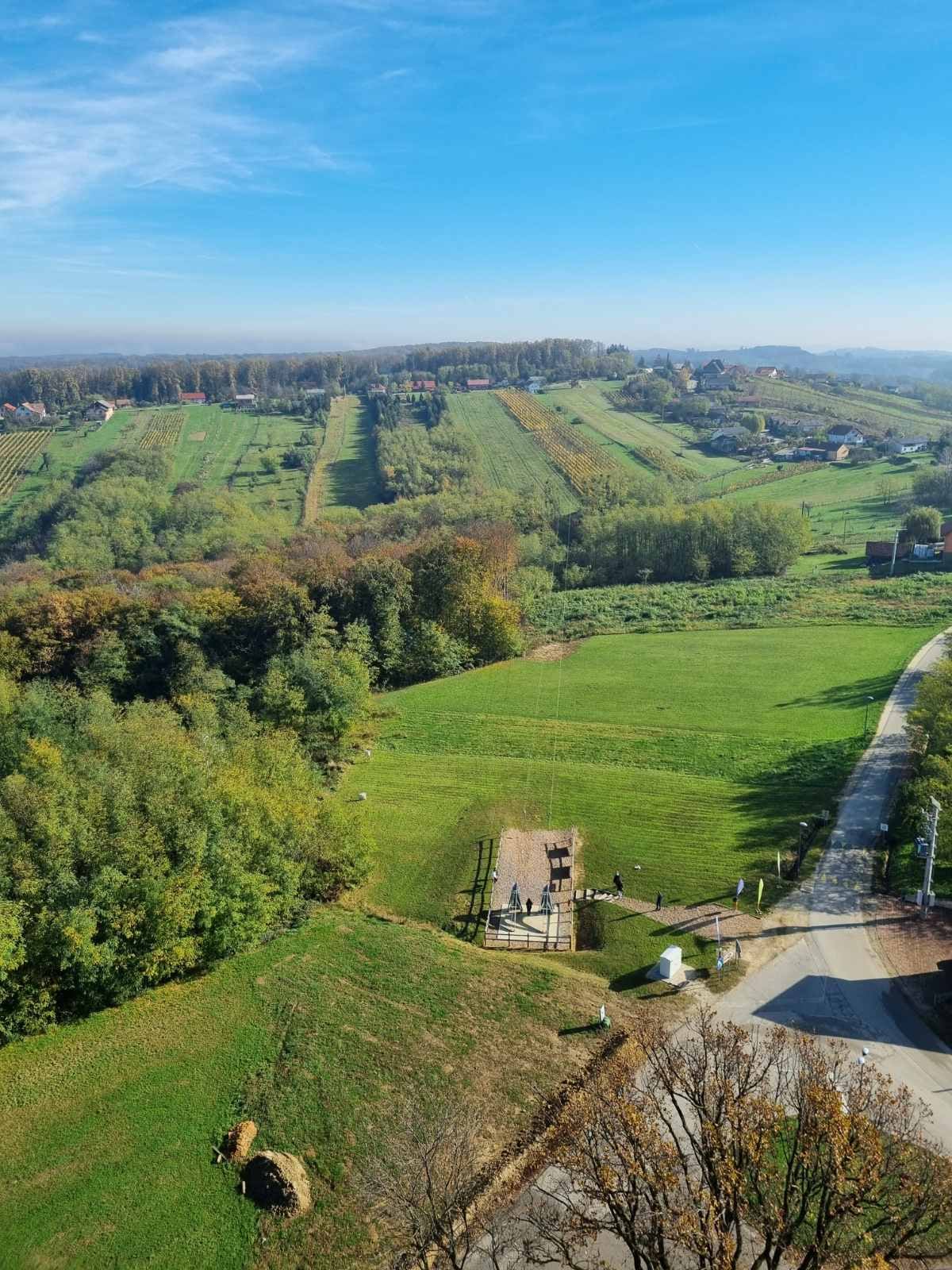 Zraven stolpa so čisto na novo uredili zip-line, ki je dolg 528 metrov. Njegova posebnost sta dve jekleni pletenici, ki omogočata spust dveh oseb hkrati – gre za edini zip-line v Sloveniji, ki trenutno ponuja to možnost. Na začetku si je seveda potrebno nadeti pravo opremo in čelado. Nato so nama vodiči razložili pravilno držo, ki sva jo na testnem zip-linu, dolgem okoli 10 metrov, tudi preizkusili. Tako sva bili pripravljeni; odpravili sva se na štartno točko (štartni stolp) ter se spustili med zelene trate in nad manjšim gozdom. Dosegli sva hitrost preko 50 metrov na uro; menda je mogoče doseči tudi okoli 65 metrov na uro, odvisno od pozicije telesa, vremenskih razmer, teže, velikosti itd.