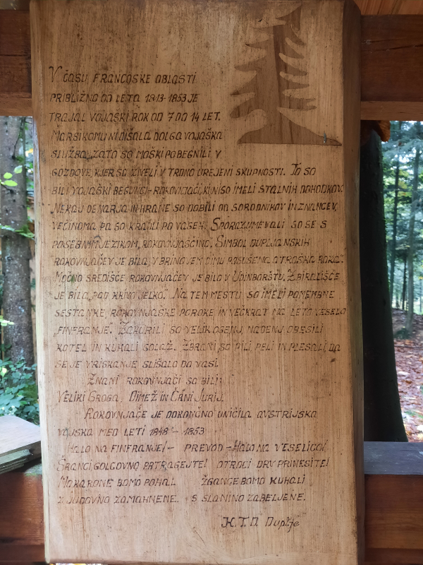 Gre za prostor, kjer so si pred 200 leti skrivna zatočišča našli roparski rokovnjači. Rokovnjači so bili po večini vojaški dezerterji, ki so prebivali in se klatili po Udin borštu v letih od 1825 do 1853. Znano zbirališče rokovnjačev je bilo pri Krivi jelki, kjer so prirejali finfranje (rokovnjaške veselice) in se tudi poročali. Ti prav posebni razbojniki so skozi leta skrivnega delovanja oblikovali poseben stil življenja ter medsebojnega jezika.