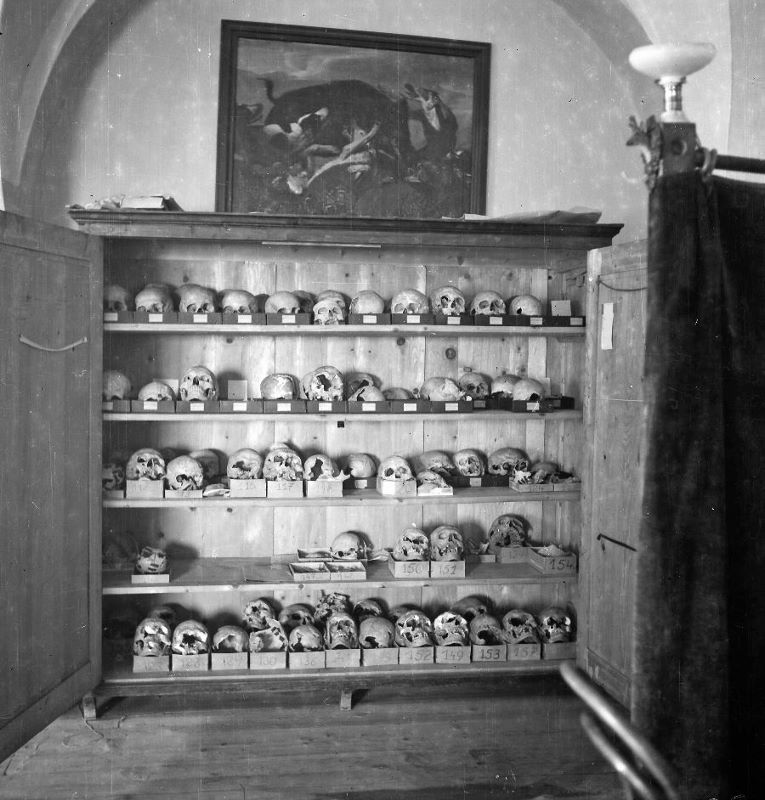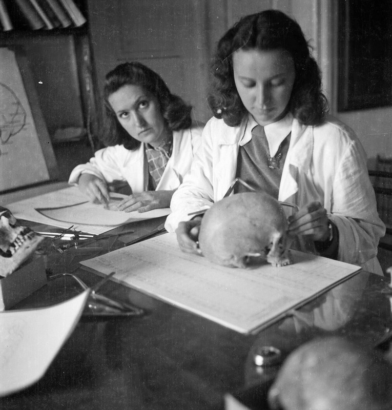 Slika 9 in 10: »Okostnjaki v omari« na ptujskem gradu leta 1946. Dve hrvaški študentki pri antropološkem delu. Temeljni namen izkopavanj leta 1946 je bil dokazati napačnost nemških in madžarskih teženj po tem prostoru. Glavna metoda razpoznavanja etničnosti je bila še vedno fizična antropologija.