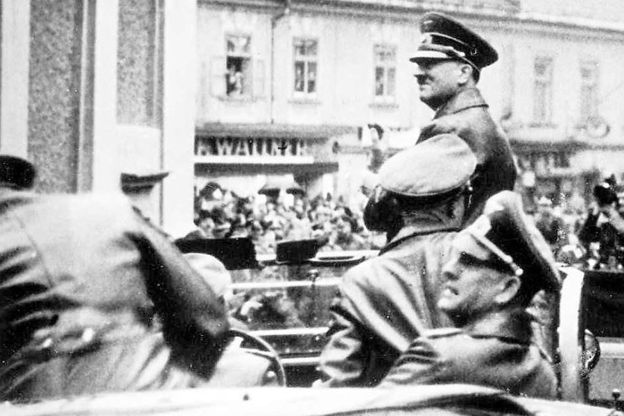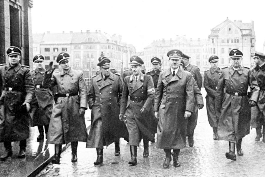 Slika 3 in 4: Adolf Hitler med vožnjo v Grajski ulici v Mariboru, kjer ga na Grajskem trgu pozdravlja navdušena množica. Adolf Hitler na Državnem (danes Starem) mostu v Mariboru. Levo od njega je štajerski gauleiter Sigfried Uiberreither. Oboje 26. aprila 1941.