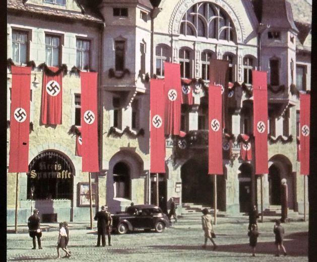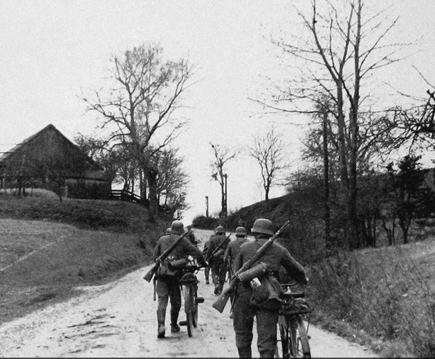 Slika 5 in 6: Pripadniki nemške kolesarske enote, 183. pehotna divizija, na poti proti Ptuju skozi eno od okoliških vasi, 8. april 1941. Medtem so se že začele sabotažne akcije etničnih Nemcev na Ptuju, kamor so Nemci vkorakali okrog pol treh popoldne na isti dan. Z nacističnimi zastavami okrašena mestna hiša na Ptuju aprila 1941.