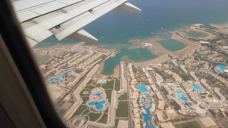 Z letališča smo se z avtobusom odpeljali v bližnjo Hurgado. Pot ni bila dolga (cca 20 minut). Videli smo nekaj puščave, nato pa smo vstopili v Hurgado. Ja, prišli smo v čisto drugo deželo – poletna temperatura (nad 30 stopinj), čudovite stavbe raznih barv, tropske rastline….Pred hotelom so nas pričakali postreščki, ki so na vsak način želeli odnesti našo prtljago v sobe (seveda za »nagrado«).