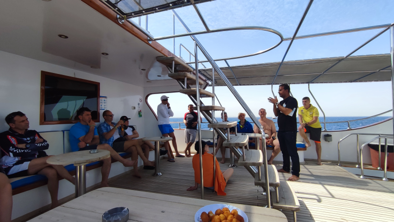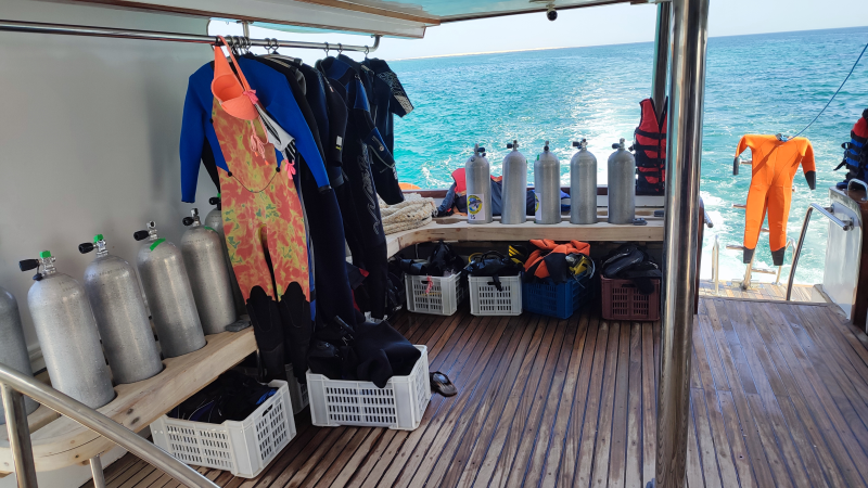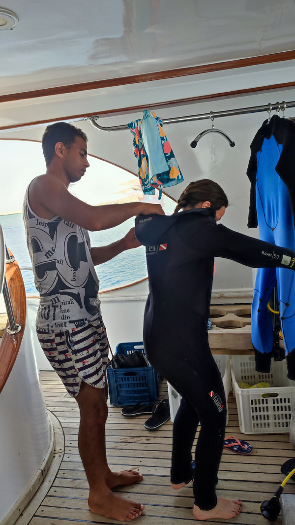 Na ladji je bila že pripravljena posadka, ki se je ves čas trudila, da nam je bilo čim bolj udobno ter da nismo bili lačni. Poleg tega so nam sestavljali opremo, pomagali pri oblačenju (še posebej ženskemu delu naše odprave) ter obuvanju plavutk.