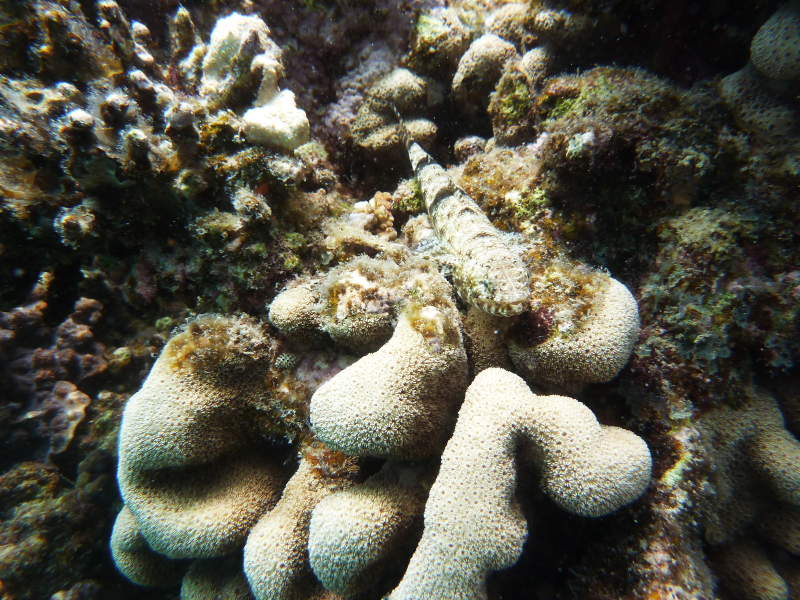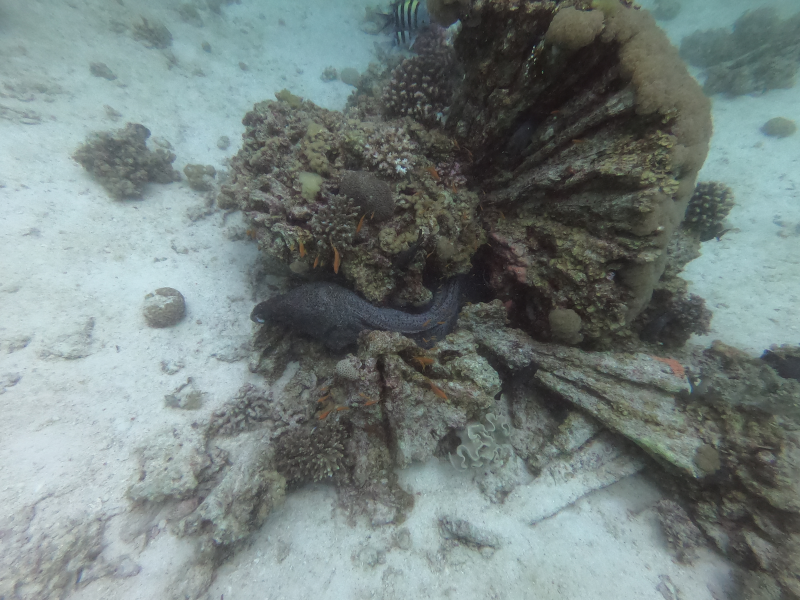Številne murene so se zavile med korale in »srepo« opazovale okolico. Vajene so radovednih potapljačev, zato se ne pustijo motiti.
