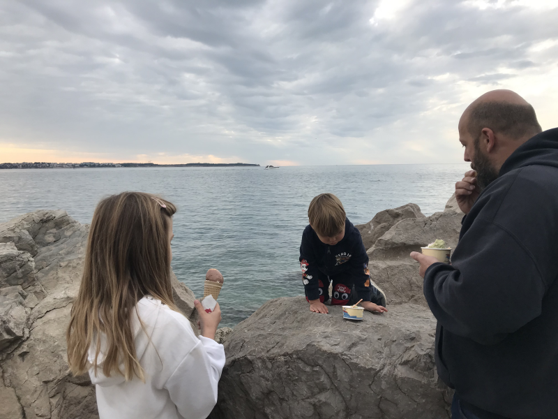 Lakota je pritiskala, zato smo si v bližnjem lokalu privoščili nekaj za pod zob. Obvezen posladek vsakega obmorskega obiska, ne glede na letni čas, pa je sladoled. Z njim v roki smo se sprehodili okrog piranskega rta, obiskali še piransko morsko deklico z delfinom in se po vzponu do cerkvice vrnili do naše obmorske potke in po njej do avtodoma. Pred odhodom smo se ustavili še na otroškem igrišču v neposredni bližini parkirišča, se čudili čudovitemu drevesu in opazovali labode na jezeru Fiesa.