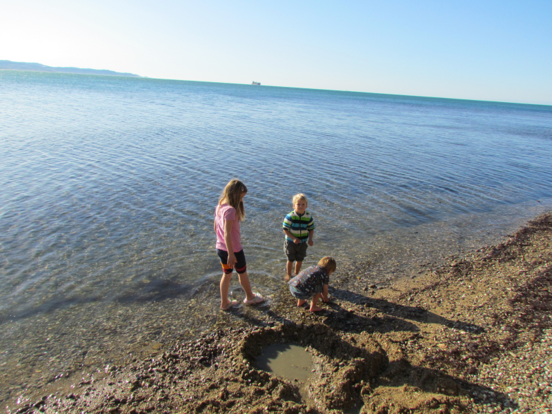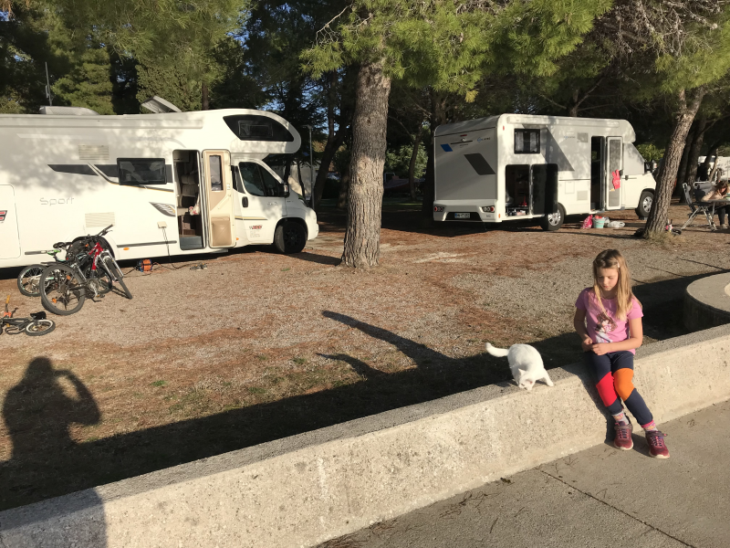 Vrnitev v kamp, skok v trgovino in nato kuhanje preprostega kosila ob opazovanju otrok skozi okno avtodoma, kako do kolen v morju gradijo pomembne konstrukcije. Božansko, samo 3 metre stran od morja – to ti ne ponudi nobena hotelska soba!