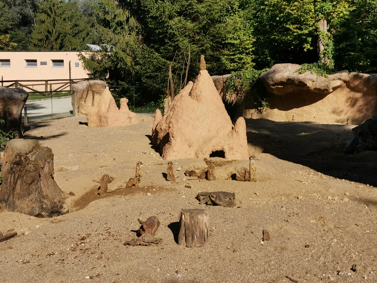 Od sajmirijev smo se podali mimo domačih (avtohtonih) živali oz. kmetije do surikat. Prihajajo iz Južne Afrike (puščavsko podnebje) in veljajo za zelo dobre plezalce. Splezajo lahko hitro in strmo visoko navzgor na razgledno točko, še spretnejše pa so v kopanju rovov. Prehranjujejo se z raznovrstno hrano (žuželke, pajki, miši, kače, kuščarji …). Ko se postavijo pokončno, opazujejo okolico in oprezajo za morebitnimi plenilci. Ves čas se oglašajo in tako med seboj komunicirajo ter člane skupine opozarjajo na nevarnost. Ker nimajo podkožne maščobe, se rade grejejo na soncu in tako nastavljajo fotoaparatom 😉