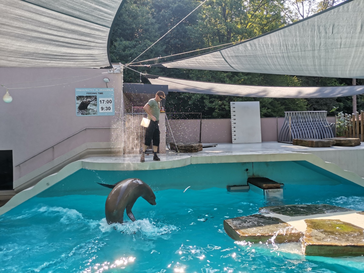 Ravno ko smo se odpravljali od surikat, se je pričelo hranjenje morskih levov. Izvedeli smo, da sta oba samca (Jib in Kalle, stara 16 in 19 let). Otroci so bili navdušeni nad predstavitvijo in so si kasneje ogledali morska leva še od spodaj (preko stekel, kako sta hitra in spretna v vodi).